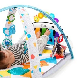 Taking advantage of Baby Einstein’s Magic Touch technology, baby can play the piano with the kick of their foot or the touch of their finger with accompanying lights. The piano keeps baby entertained with over 70 melodies, sounds, and phrases in 3 languages! This activity gym also includes 7 developmental toys - a crinkle medallion, a crinkle book, triangle rattle, textured music note teether, character flash cards, a self-discovery mirror, and a prop pillow.