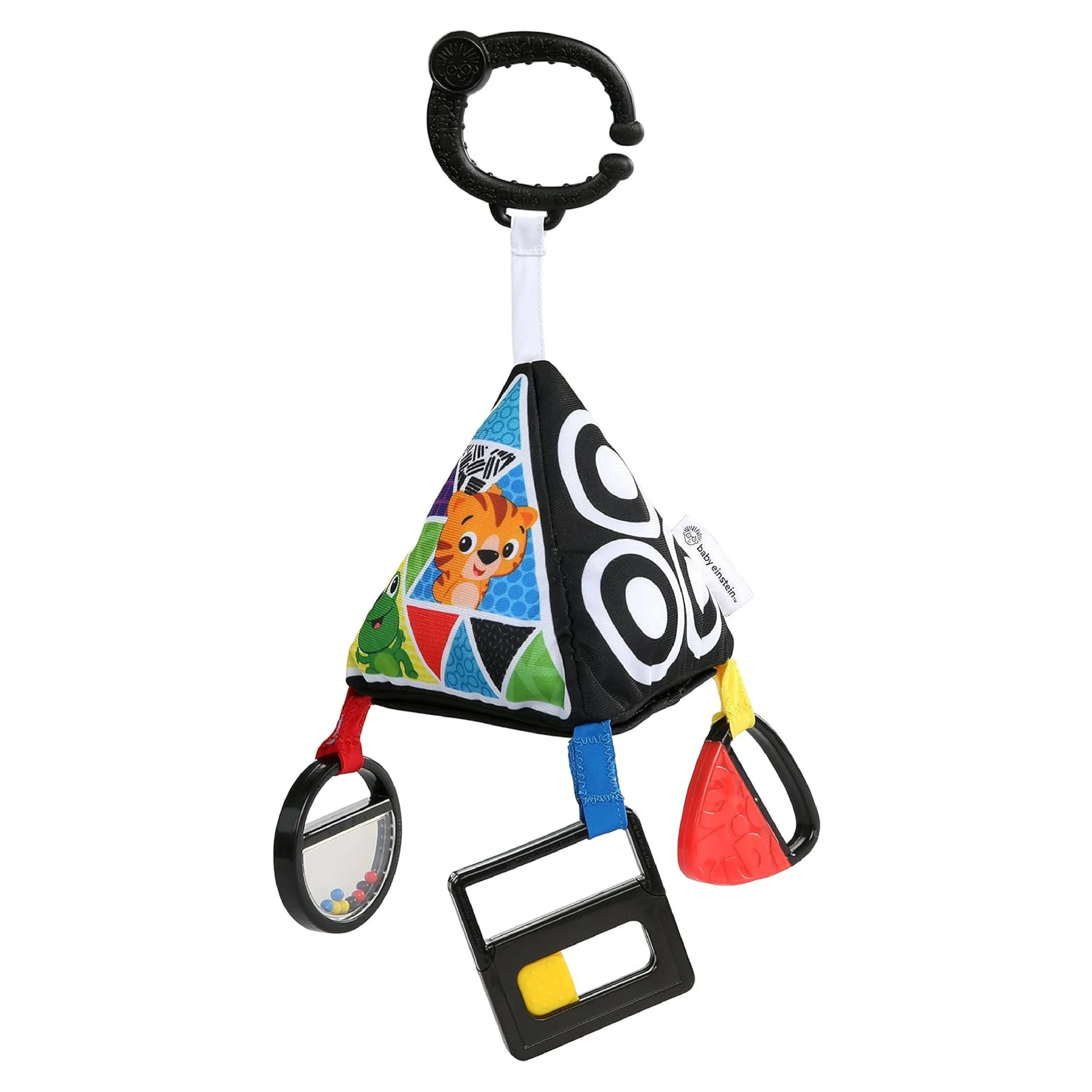 This fabric pyramid is covered with high-contrast patterns that correlates with eyesight development. The detachable hanging toys each encourages sensory play. The easy-to-attach clip allows for the pyramid to hang from countless areas, and the pyramid can be laid flat for tummy time.