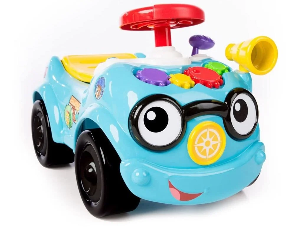 This colorful 2-in-1 push-behind and ride-on guarantees baby a mobile adventure! The dashboard offers an abundance of play as they scoot and includes a ratcheting shifter, a squeaky horn, a rotating steering wheel, and a two-button system for melodies and realistic vehicle noises. Gears on the hood can be cranked and turned to get the "engine" going.