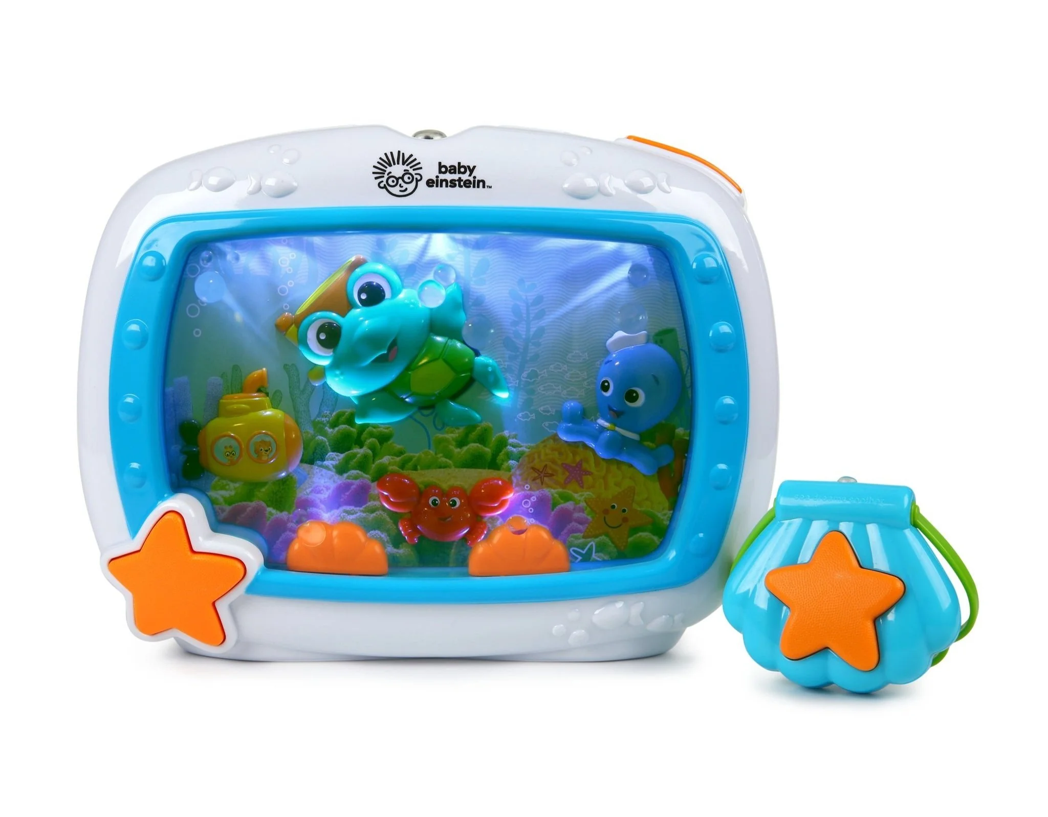 The best-selling Sea Dreams Crib Soother is a musical infant soother that features 25 plus minutes of calming lights, melodies, and ocean sounds; gently soothing babies for over 10 years. It easily attaches to most crib rails, and can stand alone on a nightstand for bedside soothing and engagement. Remote control lets parents stop or activate the soother, and babies can turn the soother on themselves if woken in the night; Features high and low volume control.