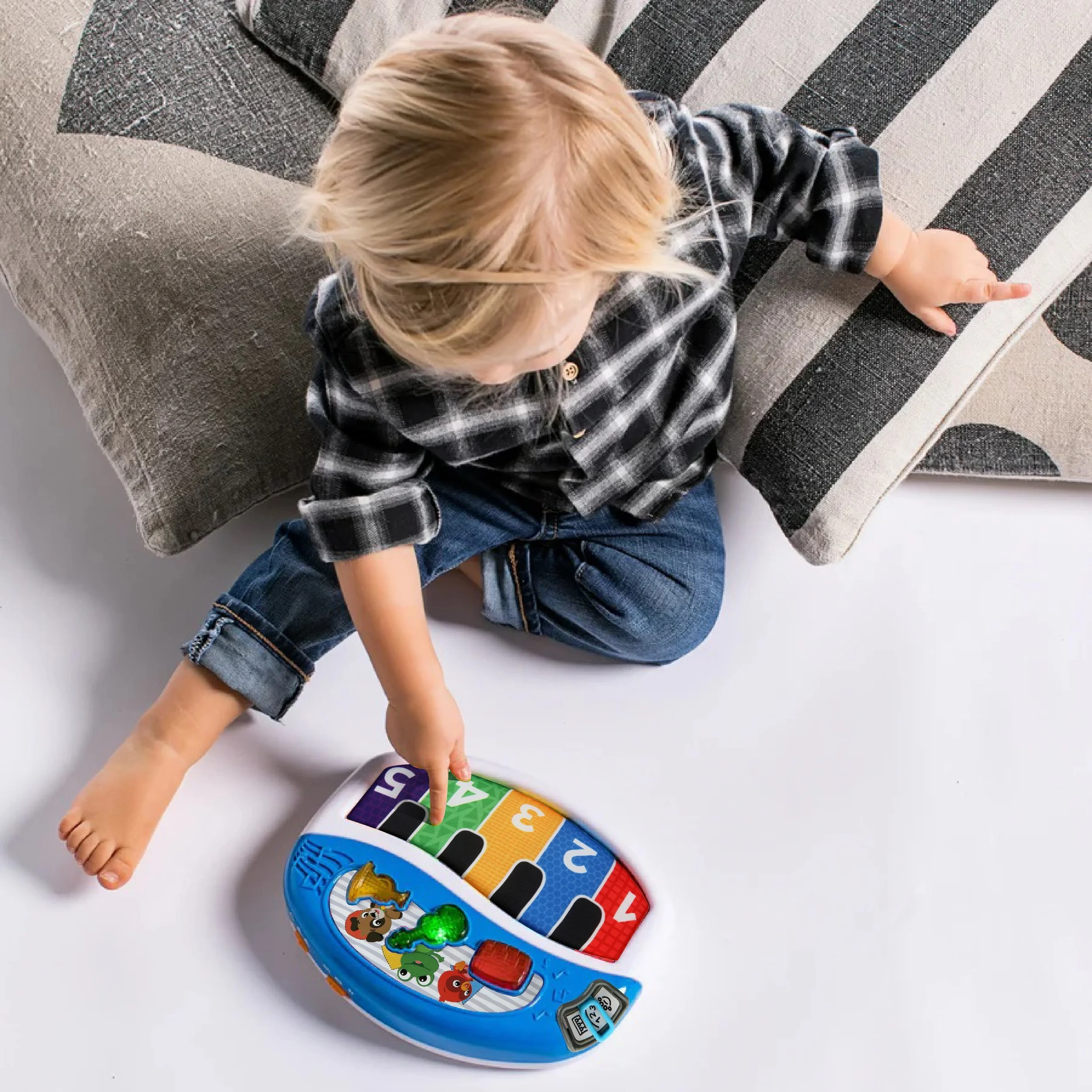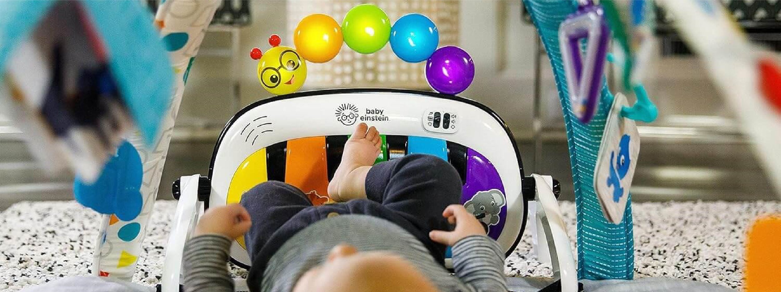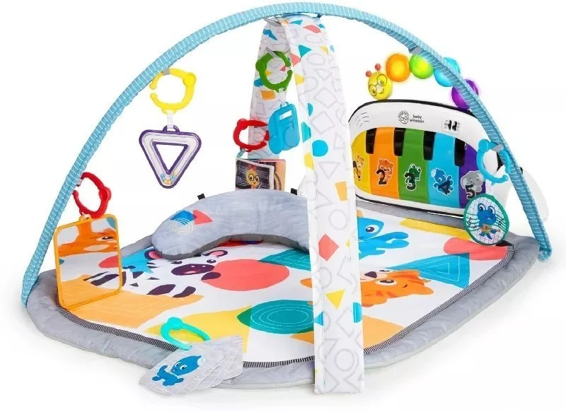 This best-selling Baby Einstein Activity Gym supports fine and gross motor skill development and cause and effect skills. 4 modes include lay and play, sitting up, tummy time, on the go; Helps baby strengthen neck muscles during tummy time. The piano includes 70 plus melodies and teaches colors, shapes, and numbers in 4 languages: English, Spanish, French, and German. This play gym includes 7 sensory toys: crinkle medallion, triangle rattle, BPA-free textured music note, flash cards, self-discovery mirror, piano toy and tummy time pillow.